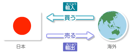 意味: 商品やサービスなどを他国との間で輸送・受け入れること。輸出は国を出ること、輸入は国に入ること。